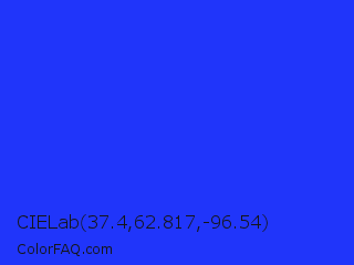 CIELab 37.4,62.817,-96.54 Color is a normal blue color and the nearest color is Palatinate Blue #273be2. Hex code #2035fa and RGB value is rgb(32,53,250). In RGB color space, this color is composed of 13% red, 21% green, 98% blue, In CMYK color space, this color is composed of 87% cyan, 79% magenta, 0% yellow , 2% black , In HSL color space, this color has a hue angle of 234° , 96% saturation and 55% lightness.