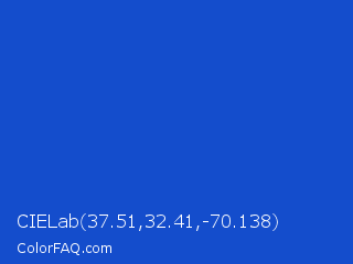 CIELab 37.51,32.41,-70.138 Color is a normal blue color and the nearest color is New Car #214fc6. Hex code #144dcc and RGB value is rgb(20,77,204). In RGB color space, this color is composed of 8% red, 30% green, 80% blue, In CMYK color space, this color is composed of 90% cyan, 62% magenta, 0% yellow , 20% black , In HSL color space, this color has a hue angle of 221° , 82% saturation and 44% lightness.