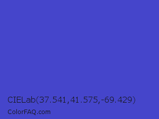 CIELab 37.541,41.575,-69.429 Color is a normal blue color and the nearest color is Iris #5a4fcf. Hex code #4545cb and RGB value is rgb(69,69,203). In RGB color space, this color is composed of 27% red, 27% green, 80% blue, In CMYK color space, this color is composed of 66% cyan, 66% magenta, 0% yellow , 20% black , In HSL color space, this color has a hue angle of 240° , 56% saturation and 53% lightness.