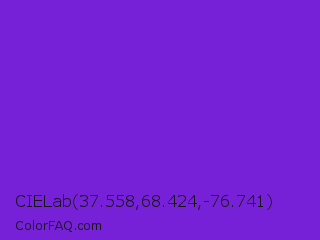 CIELab 37.558,68.424,-76.741 Color is a normal violet color and the nearest color is Blue Violet #8a2be2. Hex code #7620d8 and RGB value is rgb(118,32,216). In RGB color space, this color is composed of 46% red, 13% green, 85% blue, In CMYK color space, this color is composed of 45% cyan, 85% magenta, 0% yellow , 15% black , In HSL color space, this color has a hue angle of 268° , 74% saturation and 49% lightness.
