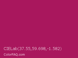 CIELab 37.55,59.698,-1.582 Color is a normal rose color and the nearest color is Jazzberry Jam #a50b5e. Hex code #a9175d and RGB value is rgb(169,23,93). In RGB color space, this color is composed of 66% red, 9% green, 36% blue, In CMYK color space, this color is composed of 0% cyan, 86% magenta, 45% yellow , 34% black , In HSL color space, this color has a hue angle of 331° , 76% saturation and 38% lightness.