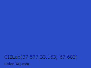 CIELab 37.577,33.163,-67.683 Color is a normal blue color and the nearest color is New Car #214fc6. Hex code #2b4cc8 and RGB value is rgb(43,76,200). In RGB color space, this color is composed of 17% red, 30% green, 78% blue, In CMYK color space, this color is composed of 79% cyan, 62% magenta, 0% yellow , 22% black , In HSL color space, this color has a hue angle of 227° , 65% saturation and 48% lightness.