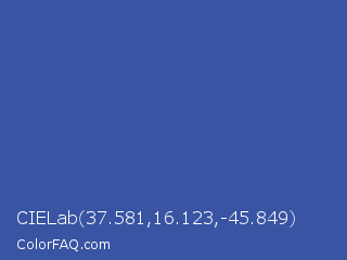 CIELab 37.581,16.123,-45.849 Color is a normal blue color and the nearest color is Azure #315ba1. Hex code #3954a3 and RGB value is rgb(57,84,163). In RGB color space, this color is composed of 22% red, 33% green, 64% blue, In CMYK color space, this color is composed of 65% cyan, 48% magenta, 0% yellow , 36% black , In HSL color space, this color has a hue angle of 225° , 48% saturation and 43% lightness.