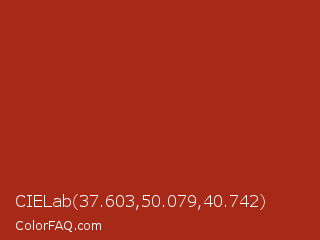 CIELab 37.603,50.079,40.742 Color is a normal red color and the nearest color is Tabasco #a02712. Hex code #a72918 and RGB value is rgb(167,41,24). In RGB color space, this color is composed of 65% red, 16% green, 9% blue, In CMYK color space, this color is composed of 0% cyan, 75% magenta, 86% yellow , 35% black , In HSL color space, this color has a hue angle of 7° , 75% saturation and 37% lightness.