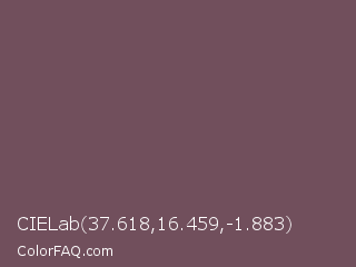 CIELab 37.618,16.459,-1.883 Color is a normal rose color and the nearest color is Zambezi #685558. Hex code #714f5c and RGB value is rgb(113,79,92). In RGB color space, this color is composed of 44% red, 31% green, 36% blue, In CMYK color space, this color is composed of 0% cyan, 30% magenta, 19% yellow , 56% black , In HSL color space, this color has a hue angle of 337° , 18% saturation and 38% lightness.