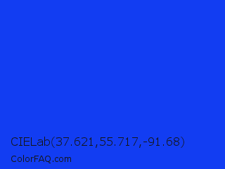 CIELab 37.621,55.717,-91.68 Color is a normal blue color and the nearest color is Blue RYB #0247fe. Hex code #123df2 and RGB value is rgb(18,61,242). In RGB color space, this color is composed of 7% red, 24% green, 95% blue, In CMYK color space, this color is composed of 93% cyan, 75% magenta, 0% yellow , 5% black , In HSL color space, this color has a hue angle of 228° , 90% saturation and 51% lightness.
