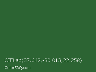 CIELab 37.642,-30.013,22.258 Color is a dark green color and the nearest color is Mughal Green #306030. Hex code #2c6433 and RGB value is rgb(44,100,51). In RGB color space, this color is composed of 17% red, 39% green, 20% blue, In CMYK color space, this color is composed of 56% cyan, 0% magenta, 49% yellow , 61% black , In HSL color space, this color has a hue angle of 128° , 39% saturation and 28% lightness.