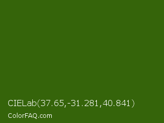 CIELab 37.65,-31.281,40.841 Color is a very dark green color and the nearest color is Dell #396413. Hex code #35640a and RGB value is rgb(53,100,10). In RGB color space, this color is composed of 21% red, 39% green, 4% blue, In CMYK color space, this color is composed of 47% cyan, 0% magenta, 90% yellow , 61% black , In HSL color space, this color has a hue angle of 91° , 82% saturation and 22% lightness.