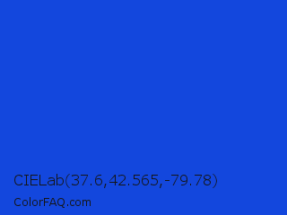 CIELab 37.6,42.565,-79.78 Color is a normal blue color and the nearest color is Palatinate Blue #273be2. Hex code #1347dd and RGB value is rgb(19,71,221). In RGB color space, this color is composed of 7% red, 28% green, 87% blue, In CMYK color space, this color is composed of 91% cyan, 68% magenta, 0% yellow , 13% black , In HSL color space, this color has a hue angle of 225° , 84% saturation and 47% lightness.