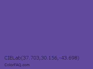 CIELab 37.703,30.156,-43.698 Color is a normal indigo color and the nearest color is Butterfly Bush #624e9a. Hex code #604aa0 and RGB value is rgb(96,74,160). In RGB color space, this color is composed of 38% red, 29% green, 63% blue, In CMYK color space, this color is composed of 40% cyan, 54% magenta, 0% yellow , 37% black , In HSL color space, this color has a hue angle of 255° , 37% saturation and 46% lightness.
