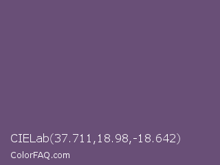 CIELab 37.711,18.98,-18.642 Color is a normal purple color and the nearest color is Smoky #605b73. Hex code #694f77 and RGB value is rgb(105,79,119). In RGB color space, this color is composed of 41% red, 31% green, 47% blue, In CMYK color space, this color is composed of 12% cyan, 34% magenta, 0% yellow , 53% black , In HSL color space, this color has a hue angle of 279° , 20% saturation and 39% lightness.