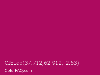 CIELab 37.712,62.912,-2.53 Color is a normal rose color and the nearest color is Lipstick #ab0563. Hex code #ad0a5f and RGB value is rgb(173,10,95). In RGB color space, this color is composed of 68% red, 4% green, 37% blue, In CMYK color space, this color is composed of 0% cyan, 94% magenta, 45% yellow , 32% black , In HSL color space, this color has a hue angle of 329° , 89% saturation and 36% lightness.