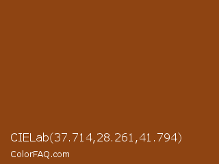 CIELab 37.714,28.261,41.794 Color is a normal orange color and the nearest color is Saddle Brown #8b4513. Hex code #8e4412 and RGB value is rgb(142,68,18). In RGB color space, this color is composed of 56% red, 27% green, 7% blue, In CMYK color space, this color is composed of 0% cyan, 52% magenta, 87% yellow , 44% black , In HSL color space, this color has a hue angle of 24° , 78% saturation and 31% lightness.