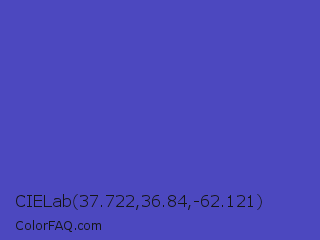CIELab 37.722,36.84,-62.121 Color is a normal indigo color and the nearest color is Ocean Blue #4f42b5. Hex code #4c48bf and RGB value is rgb(76,72,191). In RGB color space, this color is composed of 30% red, 28% green, 75% blue, In CMYK color space, this color is composed of 60% cyan, 62% magenta, 0% yellow , 25% black , In HSL color space, this color has a hue angle of 242° , 48% saturation and 52% lightness.