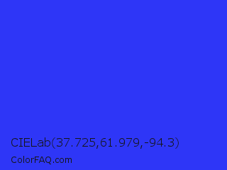 CIELab 37.725,61.979,-94.3 Color is a normal blue color and the nearest color is Palatinate Blue #273be2. Hex code #2e36f7 and RGB value is rgb(46,54,247). In RGB color space, this color is composed of 18% red, 21% green, 97% blue, In CMYK color space, this color is composed of 81% cyan, 78% magenta, 0% yellow , 3% black , In HSL color space, this color has a hue angle of 238° , 93% saturation and 57% lightness.