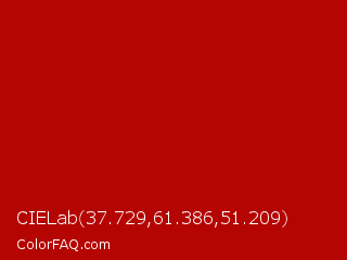 CIELab 37.729,61.386,51.209 Color is a normal red color and the nearest color is Guardsman Red #ba0101. Hex code #b50502 and RGB value is rgb(181,5,2). In RGB color space, this color is composed of 71% red, 2% green, 1% blue, In CMYK color space, this color is composed of 0% cyan, 97% magenta, 99% yellow , 29% black , In HSL color space, this color has a hue angle of 1° , 98% saturation and 36% lightness.