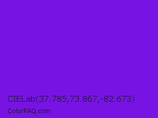 CIELab 37.785,73.867,-82.673 Color is a normal violet color and the nearest color is Blue Violet #8a2be2. Hex code #7714e3 and RGB value is rgb(119,20,227). In RGB color space, this color is composed of 47% red, 8% green, 89% blue, In CMYK color space, this color is composed of 48% cyan, 91% magenta, 0% yellow , 11% black , In HSL color space, this color has a hue angle of 269° , 84% saturation and 48% lightness.