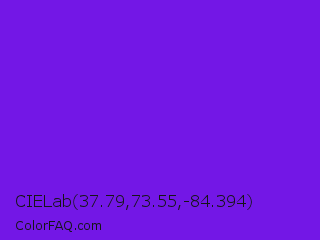 CIELab 37.79,73.55,-84.394 Color is a normal violet color and the nearest color is Blue Violet #8a2be2. Hex code #7317e6 and RGB value is rgb(115,23,230). In RGB color space, this color is composed of 45% red, 9% green, 90% blue, In CMYK color space, this color is composed of 50% cyan, 90% magenta, 0% yellow , 10% black , In HSL color space, this color has a hue angle of 267° , 82% saturation and 50% lightness.