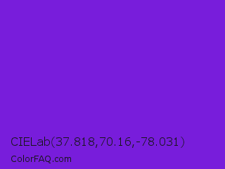 CIELab 37.818,70.16,-78.031 Color is a normal violet color and the nearest color is Blue Violet #8a2be2. Hex code #781ddb and RGB value is rgb(120,29,219). In RGB color space, this color is composed of 47% red, 11% green, 86% blue, In CMYK color space, this color is composed of 45% cyan, 87% magenta, 0% yellow , 14% black , In HSL color space, this color has a hue angle of 269° , 77% saturation and 49% lightness.