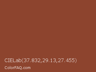 CIELab 37.832,29.13,27.455 Color is a normal red color and the nearest color is Mule Fawn #8c472f. Hex code #8d442e and RGB value is rgb(141,68,46). In RGB color space, this color is composed of 55% red, 27% green, 18% blue, In CMYK color space, this color is composed of 0% cyan, 52% magenta, 67% yellow , 45% black , In HSL color space, this color has a hue angle of 14° , 51% saturation and 37% lightness.