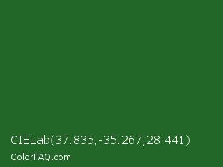 CIELab 37.835,-35.267,28.441 Color is a dark green color and the nearest color is Mughal Green #306030. Hex code #226628 and RGB value is rgb(34,102,40). In RGB color space, this color is composed of 13% red, 40% green, 16% blue, In CMYK color space, this color is composed of 67% cyan, 0% magenta, 61% yellow , 60% black , In HSL color space, this color has a hue angle of 125° , 50% saturation and 27% lightness.