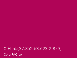 CIELab 37.852,63.623,2.879 Color is a normal rose color and the nearest color is Lipstick #ab0563. Hex code #b00457 and RGB value is rgb(176,4,87). In RGB color space, this color is composed of 69% red, 2% green, 34% blue, In CMYK color space, this color is composed of 0% cyan, 98% magenta, 51% yellow , 31% black , In HSL color space, this color has a hue angle of 331° , 96% saturation and 35% lightness.