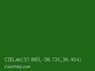 CIELab 37.885,-38.731,36.404 Color is a dark green color and the nearest color is Lincoln Green #195905. Hex code #1d6717 and RGB value is rgb(29,103,23). In RGB color space, this color is composed of 11% red, 40% green, 9% blue, In CMYK color space, this color is composed of 72% cyan, 0% magenta, 78% yellow , 60% black , In HSL color space, this color has a hue angle of 116° , 63% saturation and 25% lightness.