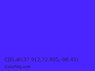 CIELab 37.912,72.805,-98.43 Color is a normal indigo color and the nearest color is Han Purple #5218fa. Hex code #4b25ff and RGB value is rgb(75,37,255). In RGB color space, this color is composed of 29% red, 15% green, 100% blue, In CMYK color space, this color is composed of 71% cyan, 85% magenta, 0% yellow , 0% black , In HSL color space, this color has a hue angle of 250° , 100% saturation and 57% lightness.