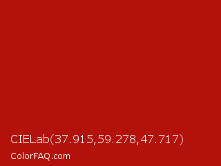 CIELab 37.915,59.278,47.717 Color is a normal red color and the nearest color is International Orange Engineering #ba160c. Hex code #b3120b and RGB value is rgb(179,18,11). In RGB color space, this color is composed of 70% red, 7% green, 4% blue, In CMYK color space, this color is composed of 0% cyan, 90% magenta, 94% yellow , 30% black , In HSL color space, this color has a hue angle of 3° , 88% saturation and 37% lightness.