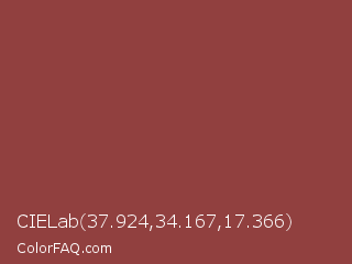 CIELab 37.924,34.167,17.366 Color is a normal red color and the nearest color is Smoky Topaz #933d41. Hex code #91403f and RGB value is rgb(145,64,63). In RGB color space, this color is composed of 57% red, 25% green, 25% blue, In CMYK color space, this color is composed of 0% cyan, 56% magenta, 57% yellow , 43% black , In HSL color space, this color has a hue angle of 1° , 39% saturation and 41% lightness.