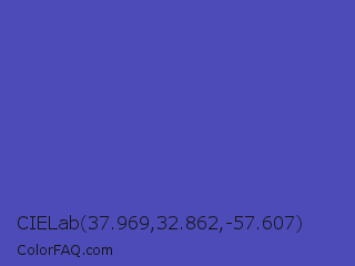 CIELab 37.969,32.862,-57.607 Color is a normal indigo color and the nearest color is Ocean Blue #4f42b5. Hex code #4d4bb8 and RGB value is rgb(77,75,184). In RGB color space, this color is composed of 30% red, 29% green, 72% blue, In CMYK color space, this color is composed of 58% cyan, 59% magenta, 0% yellow , 28% black , In HSL color space, this color has a hue angle of 241° , 43% saturation and 51% lightness.