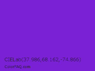 CIELab 37.986,68.162,-74.866 Color is a normal violet color and the nearest color is Blue Violet #8a2be2. Hex code #7a21d6 and RGB value is rgb(122,33,214). In RGB color space, this color is composed of 48% red, 13% green, 84% blue, In CMYK color space, this color is composed of 43% cyan, 85% magenta, 0% yellow , 16% black , In HSL color space, this color has a hue angle of 270° , 73% saturation and 48% lightness.