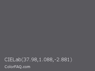 CIELab 37.98,1.088,-2.881 Color is a normal blue color and the nearest color is Scarpa Flow #585562. Hex code #59595e and RGB value is rgb(89,89,94). In RGB color space, this color is composed of 35% red, 35% green, 37% blue, In CMYK color space, this color is composed of 5% cyan, 5% magenta, 0% yellow , 63% black , In HSL color space, this color has a hue angle of 240° , 3% saturation and 36% lightness.