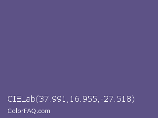 CIELab 37.991,16.955,-27.518 Color is a normal indigo color and the nearest color is Purple Navy #4e5180. Hex code #5d5286 and RGB value is rgb(93,82,134). In RGB color space, this color is composed of 36% red, 32% green, 53% blue, In CMYK color space, this color is composed of 31% cyan, 39% magenta, 0% yellow , 47% black , In HSL color space, this color has a hue angle of 253° , 24% saturation and 42% lightness.