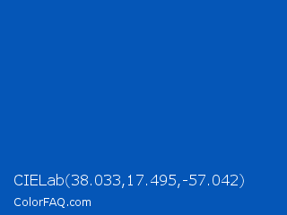 CIELab 38.033,17.495,-57.042 Color is a normal blue color and the nearest color is Sapphire #0f52ba. Hex code #0556b7 and RGB value is rgb(5,86,183). In RGB color space, this color is composed of 2% red, 34% green, 72% blue, In CMYK color space, this color is composed of 97% cyan, 53% magenta, 0% yellow , 28% black , In HSL color space, this color has a hue angle of 213° , 95% saturation and 37% lightness.