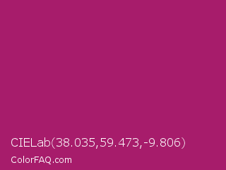 CIELab 38.035,59.473,-9.806 Color is a normal magenta color and the nearest color is Amaranth Deep Purple #9f2b68. Hex code #a71c6b and RGB value is rgb(167,28,107). In RGB color space, this color is composed of 65% red, 11% green, 42% blue, In CMYK color space, this color is composed of 0% cyan, 83% magenta, 36% yellow , 35% black , In HSL color space, this color has a hue angle of 326° , 71% saturation and 38% lightness.