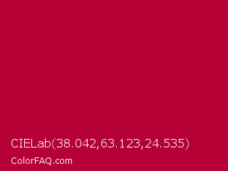 CIELab 38.042,63.123,24.535 Color is a normal rose color and the nearest color is Shiraz #b20931. Hex code #b50136 and RGB value is rgb(181,1,54). In RGB color space, this color is composed of 71% red, 0% green, 21% blue, In CMYK color space, this color is composed of 0% cyan, 99% magenta, 70% yellow , 29% black , In HSL color space, this color has a hue angle of 342° , 99% saturation and 36% lightness.