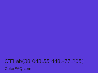 CIELab 38.043,55.448,-77.205 Color is a normal indigo color and the nearest color is Majorelle Blue #6050dc. Hex code #5939da and RGB value is rgb(89,57,218). In RGB color space, this color is composed of 35% red, 22% green, 85% blue, In CMYK color space, this color is composed of 59% cyan, 74% magenta, 0% yellow , 15% black , In HSL color space, this color has a hue angle of 252° , 69% saturation and 54% lightness.