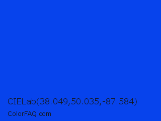 CIELab 38.049,50.035,-87.584 Color is a normal blue color and the nearest color is Blue RYB #0247fe. Hex code #0743ec and RGB value is rgb(7,67,236). In RGB color space, this color is composed of 3% red, 26% green, 93% blue, In CMYK color space, this color is composed of 97% cyan, 72% magenta, 0% yellow , 7% black , In HSL color space, this color has a hue angle of 224° , 94% saturation and 48% lightness.