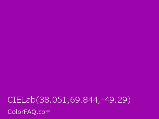 CIELab 38.051,69.844,-49.29 Color is a normal magenta color and the nearest color is Violet Eggplant #991199. Hex code #9c05ab and RGB value is rgb(156,5,171). In RGB color space, this color is composed of 61% red, 2% green, 67% blue, In CMYK color space, this color is composed of 9% cyan, 97% magenta, 0% yellow , 33% black , In HSL color space, this color has a hue angle of 295° , 94% saturation and 35% lightness.