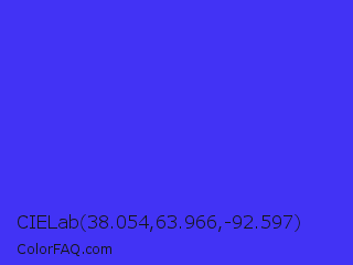 CIELab 38.054,63.966,-92.597 Color is a normal indigo color and the nearest color is Han Purple #5218fa. Hex code #4233f5 and RGB value is rgb(66,51,245). In RGB color space, this color is composed of 26% red, 20% green, 96% blue, In CMYK color space, this color is composed of 73% cyan, 79% magenta, 0% yellow , 4% black , In HSL color space, this color has a hue angle of 245° , 91% saturation and 58% lightness.