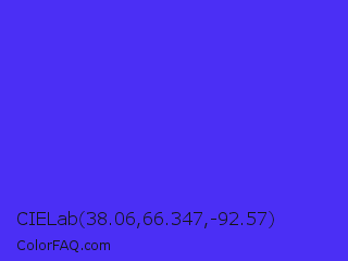 CIELab 38.06,66.347,-92.57 Color is a normal indigo color and the nearest color is Han Purple #5218fa. Hex code #4b2ff5 and RGB value is rgb(75,47,245). In RGB color space, this color is composed of 29% red, 18% green, 96% blue, In CMYK color space, this color is composed of 69% cyan, 81% magenta, 0% yellow , 4% black , In HSL color space, this color has a hue angle of 248° , 91% saturation and 57% lightness.