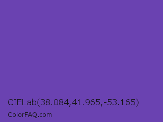 CIELab 38.084,41.965,-53.165 Color is a normal violet color and the nearest color is Studio #714ab2. Hex code #6a42b1 and RGB value is rgb(106,66,177). In RGB color space, this color is composed of 42% red, 26% green, 69% blue, In CMYK color space, this color is composed of 40% cyan, 63% magenta, 0% yellow , 31% black , In HSL color space, this color has a hue angle of 262° , 46% saturation and 48% lightness.