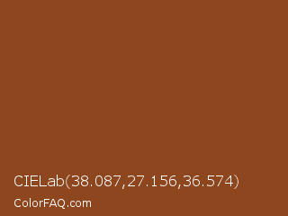 CIELab 38.087,27.156,36.574 Color is a normal orange color and the nearest color is Cumin #924321. Hex code #8d461e and RGB value is rgb(141,70,30). In RGB color space, this color is composed of 55% red, 27% green, 12% blue, In CMYK color space, this color is composed of 0% cyan, 50% magenta, 79% yellow , 45% black , In HSL color space, this color has a hue angle of 22° , 65% saturation and 34% lightness.