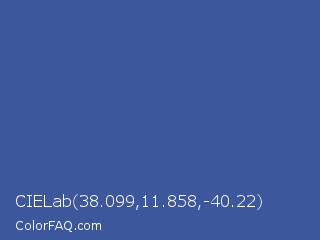 CIELab 38.099,11.858,-40.22 Color is a normal blue color and the nearest color is Azure #315ba1. Hex code #3c579b and RGB value is rgb(60,87,155). In RGB color space, this color is composed of 24% red, 34% green, 61% blue, In CMYK color space, this color is composed of 61% cyan, 44% magenta, 0% yellow , 39% black , In HSL color space, this color has a hue angle of 223° , 44% saturation and 42% lightness.