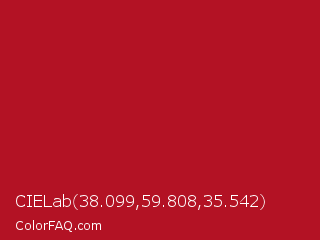 CIELab 38.099,59.808,35.542 Color is a normal red color and the nearest color is Carnelian #b31b1b. Hex code #b31224 and RGB value is rgb(179,18,36). In RGB color space, this color is composed of 70% red, 7% green, 14% blue, In CMYK color space, this color is composed of 0% cyan, 90% magenta, 80% yellow , 30% black , In HSL color space, this color has a hue angle of 353° , 82% saturation and 39% lightness.