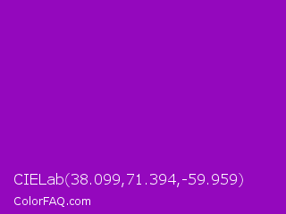 CIELab 38.099,71.394,-59.959 Color is a normal purple color and the nearest color is Purple Munsell #9f00c5. Hex code #9408bd and RGB value is rgb(148,8,189). In RGB color space, this color is composed of 58% red, 3% green, 74% blue, In CMYK color space, this color is composed of 22% cyan, 96% magenta, 0% yellow , 26% black , In HSL color space, this color has a hue angle of 286° , 92% saturation and 39% lightness.