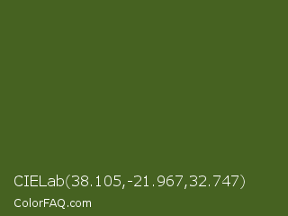 CIELab 38.105,-21.967,32.747 Color is a dark green color and the nearest color is Dark Moss Green #4a5d23. Hex code #466221 and RGB value is rgb(70,98,33). In RGB color space, this color is composed of 27% red, 38% green, 13% blue, In CMYK color space, this color is composed of 29% cyan, 0% magenta, 66% yellow , 62% black , In HSL color space, this color has a hue angle of 86° , 50% saturation and 26% lightness.