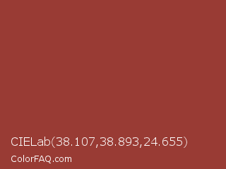 CIELab 38.107,38.893,24.655 Color is a normal red color and the nearest color is Stiletto #9c3336. Hex code #993b34 and RGB value is rgb(153,59,52). In RGB color space, this color is composed of 60% red, 23% green, 20% blue, In CMYK color space, this color is composed of 0% cyan, 61% magenta, 66% yellow , 40% black , In HSL color space, this color has a hue angle of 4° , 49% saturation and 40% lightness.