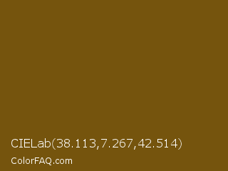 CIELab 38.113,7.267,42.514 Color is a dark orange color and the nearest color is Raw Umber #734a12. Hex code #75540d and RGB value is rgb(117,84,13). In RGB color space, this color is composed of 46% red, 33% green, 5% blue, In CMYK color space, this color is composed of 0% cyan, 28% magenta, 89% yellow , 54% black , In HSL color space, this color has a hue angle of 41° , 80% saturation and 25% lightness.